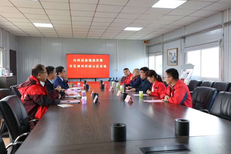 在科研示范基地,张东生一行实地参观了地热试验井、1号机组、2号机组、换热站、温室连栋大棚等,详细了解了发电工艺、试验机组发电情况。在召开的现场座谈会上,张昌生对张东生一行的到来表示热烈欢迎,并重点介绍了地热基地建设情况、规模、发展前景及下一步地热资源梯级开发利用设想等。张东生对科研示范基地建设给予了高度评价,并介绍了山东局在地热开发利用方面取得的研究成果。随后,双方就地热资源开发利用、钻探工艺、泥浆性能、回灌及地下水结垢等进行了深入交流。双方一致表示,地热资源是清洁的可再生能源,对于优化能源结构、实现碳达峰碳中和具有重要意义,希望能在地热资源开发利用方面加强合作,共同推进绿色低碳发展。