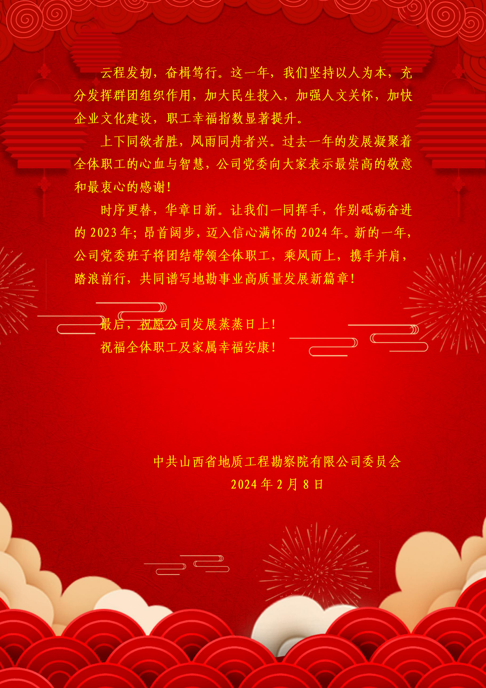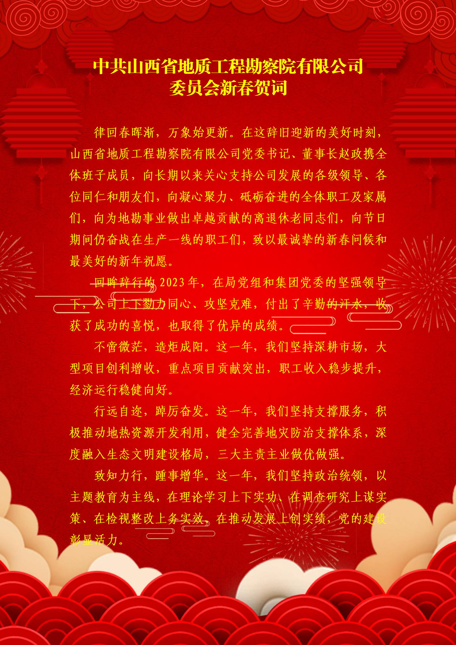 【概要描述】 律回春晖渐,万象始更新。在这辞旧迎新的美好时刻betway平台党委书记、董事长赵政携全体班子成员,向长期以来关心支持公司发展的各级领导、各位同仁和朋友们,向凝心聚力、砥砺奋进的全体职工及家属们,向为地勘事业做出卓越贡献的离退休老同志们,向节日期间仍奋战在生产一线的职工们,致以最诚挚的新春问候和最美好的新年祝愿。