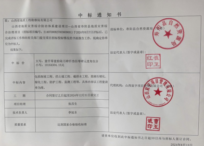 近日,我公司下属生态环境公司成功中标山西省地质灾害综合防治体系建设项目——山西省寿阳县地质灾害综合治理项目,中标金额为1016.430415万元。