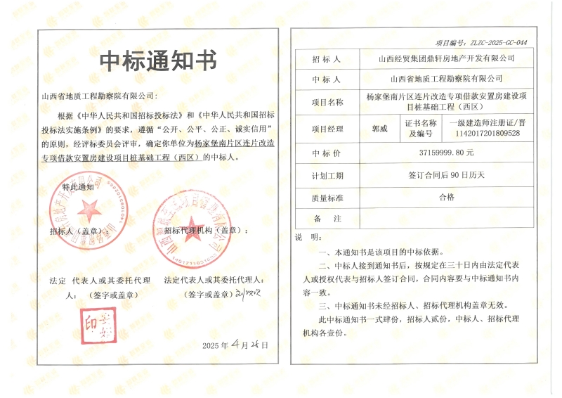 4月28日,betway平台下属岩土工程公司中标杨家堡南片区连片改造专项借款安置房建设项目桩基础工程(西区)项目,中标价:37159999.8元。