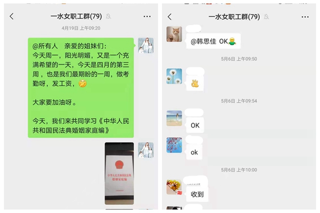 【概要描述】 我队女工委带领女职工利用微信群学习的方式,分享《妇女权益保障法》、《女职工保护条例》、《婚姻法》、《劳动法》、《民法典》等相关法律、法规内容。让女职工们在繁忙的工作之余,通过学习充分了解与自身利益密切相关的各项规章制度,维护自身权益。同时,能够有积极的心态,正确的方法,更好的处理生活琐事,有更多的精力投入到工作中。(韩丽清)